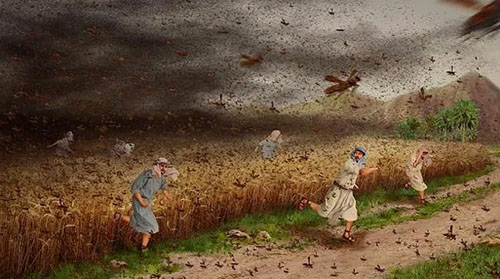 5.1. La plaga de langostas (vv.3-8) Aunque se emplean cuatro palabras diferentes, no se refiere a cuatro plagas distintas, sino que cada nombre de insecto es otra manera de designar a la langosta, pues en hebreo hay nueve palabras diferentes para "langosta". Los acrídidos, conocidos popularmente como langostas o saltamontes, son una familia de insectos ortópteros caracterizados por su gran facilidad para migrar de un sitio a otro y, en determinadas circunstancias, reproducirse muy rápidamente llegando a formar devastadoras plagas.
